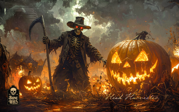 "Upon this Hallow's Eve, I encountered a farmer working the fields in the dark of night. How he was able to toil in the darkness was beyond my understanding. Perhaps he knew his craft, his fields better than I thought possible. I approached cautiously from behind as to not startle the gent, but when I crested the hill beyond, I heard haunting screams in the crisp air. His scythe flew back and forth with vim and vigor. He was not harvesting grains, but slicing an array of screaming jack-o'- lanterns. It was as if he was harvesting souls for the great beyond."